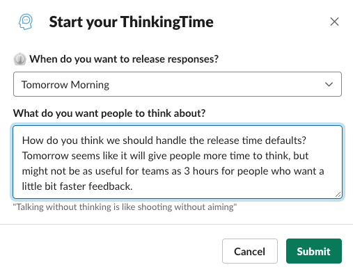 To initiate a ThinkingTime request for your team, simply type /thinkingtime and your request into a Slack channel.
